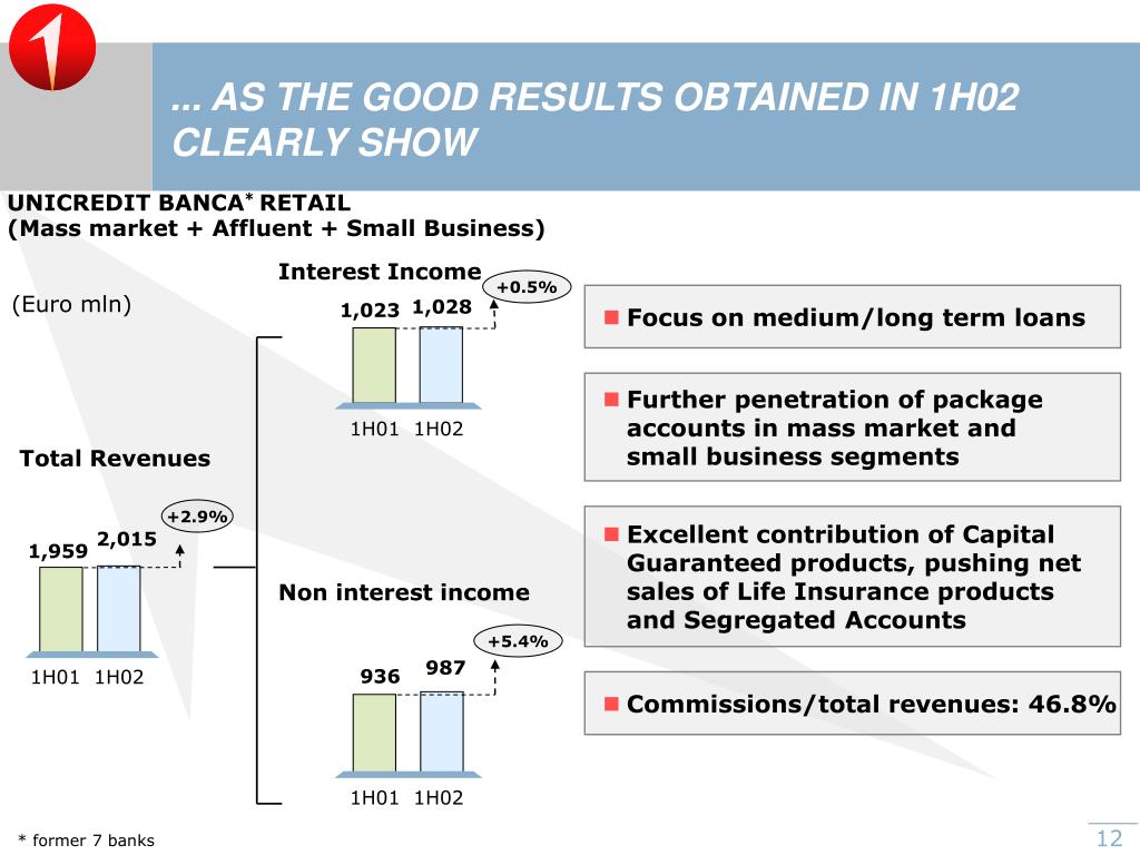 Focus on medium/long term loans • Further penetration of package accounts in mass market and small business segments • Excellent contribution of Capital Guaranteed products, pushing net sales of Life Insurance products and Segregated Accounts • Commissions/total revenues: 46.8% ... AS THE GOOD RESULTS OBTAINED IN 1H02 CLEARLY SHOW UNICREDIT BANCA* RETAIL (Mass market + Affluent + Small Business) Interest Income +0.5% (Euro mln) 1,028 1,023 1H01 1H02 Total Revenues +2.9% 2,015 1,959 Non interest income +5.4% 987 1H01 1H02 936 1H01 1H02 * former 7 banks