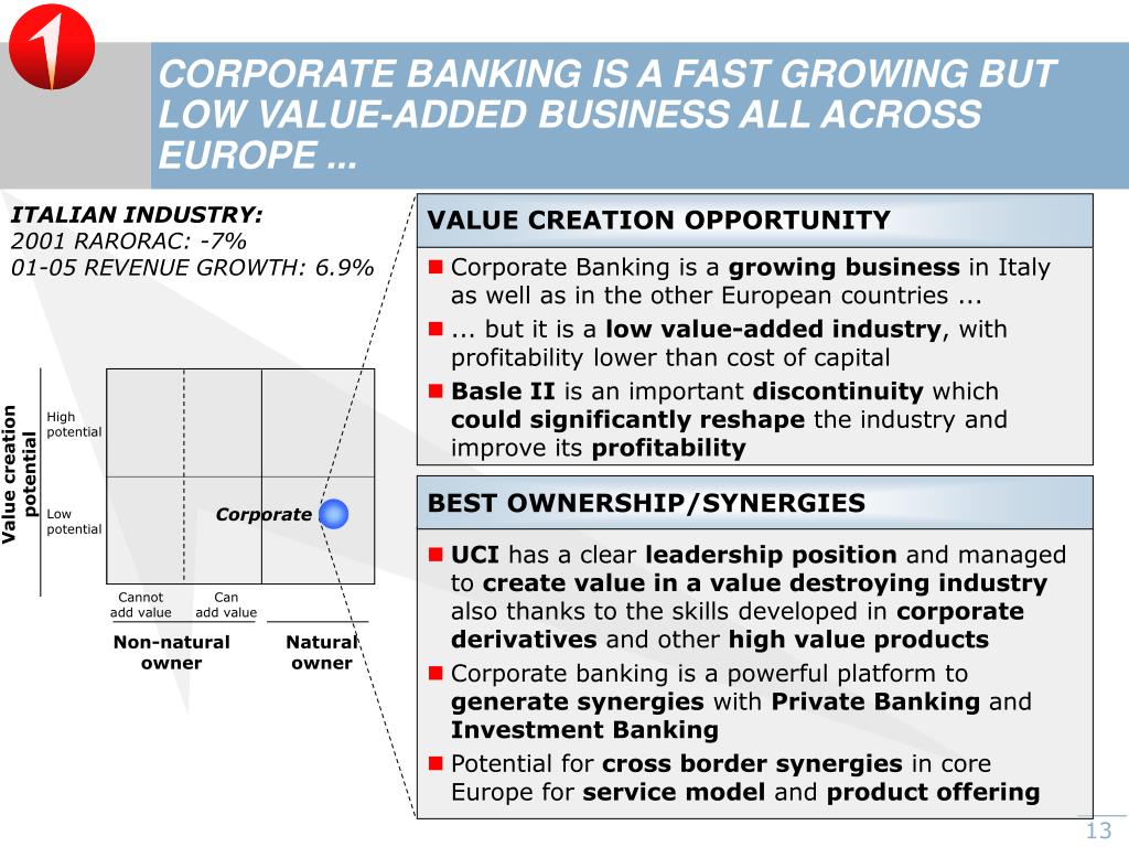 CORPORATE BANKING IS A FAST GROWING BUT LOW VALUE-ADDED BUSINESS ALL ACROSS EUROPE ... ITALIAN INDUSTRY: 2001 RARORAC: -7% 01-05 REVENUE GROWTH: 6.9% VALUE CREATION OPPORTUNITY • Corporate Banking is a growing business in Italy as well as in the other European countries ... • ... but it is a low value-added industry, with profitability lower than cost of capital • Basle II is an important discontinuity which could significantly reshape the industry and improve its profitability High potential Value creation potential BEST OWNERSHIP/SYNERGIES Corporate Low potential • UCI has a clear leadership position and managed to create value in a value destroying industry also thanks to the skills developed in corporate derivatives and other high value products • Corporate banking is a powerful platform to generate synergies with Private Banking and Investment Banking • Potential for cross border synergies in core Europe for service model and product offering Cannot add value Can add value Non-natural owner Natural owner