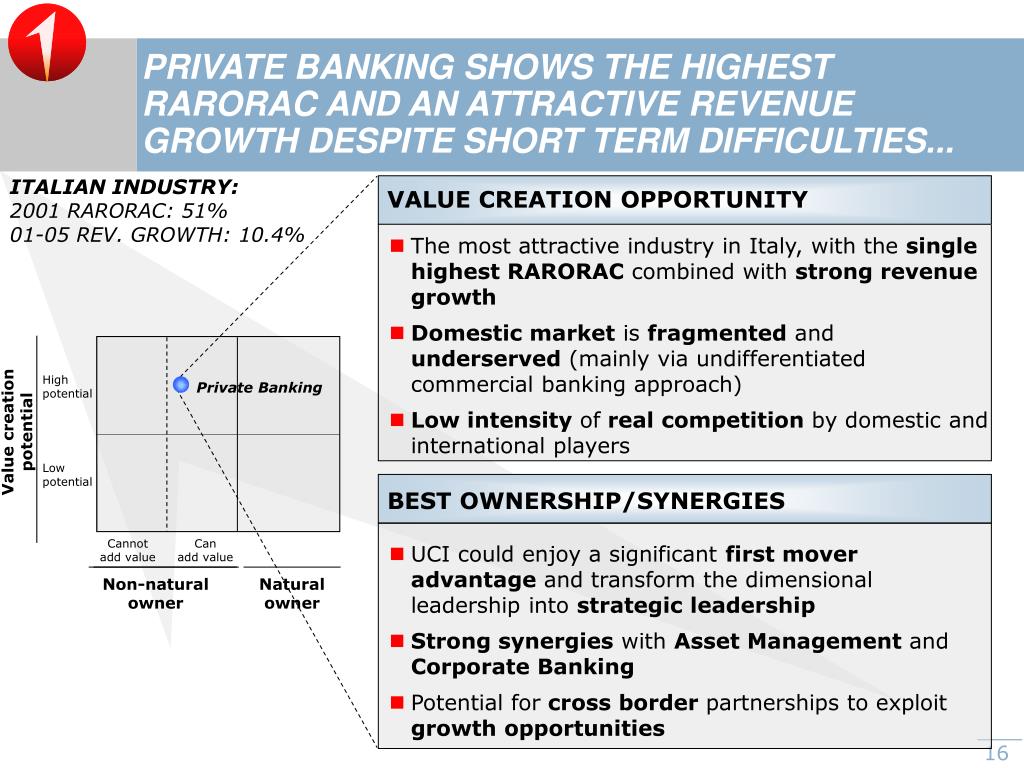 PRIVATE BANKING SHOWS THE HIGHEST RARORAC AND AN ATTRACTIVE REVENUE GROWTH DESPITE SHORT TERM DIFFICULTIES... ITALIAN INDUSTRY: 2001 RARORAC: 51% 01-05 REV. GROWTH: 10.4% VALUE CREATION OPPORTUNITY • The most attractive industry in Italy, with the single highest RARORAC combined with strong revenue growth • Domestic market is fragmented and underserved (mainly via undifferentiated commercial banking approach) • Low intensity of real competition by domestic and international players High potential Private Banking Value creation potential Low potential BEST OWNERSHIP/SYNERGIES Cannot add value Can add value • UCI could enjoy a significant first mover advantage and transform the dimensional leadership into strategic leadership • Strong synergies with Asset Management and Corporate Banking • Potential for cross border partnerships to exploit growth opportunities Non-natural owner Natural owner