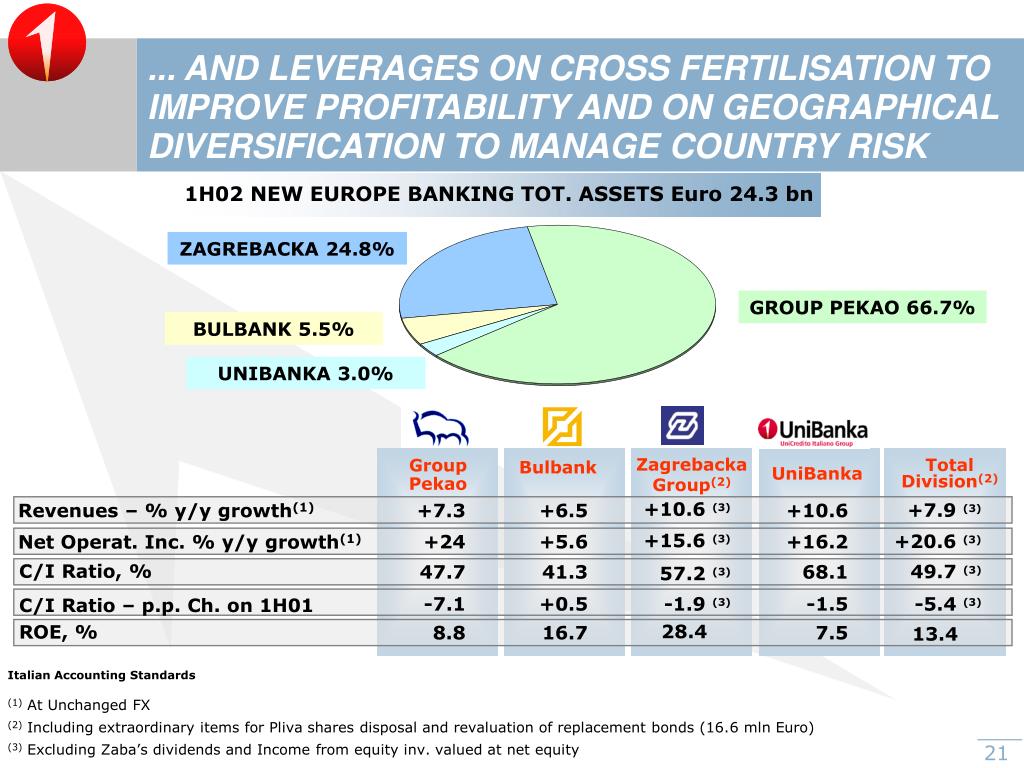 ... AND LEVERAGES ON CROSS FERTILISATION TO IMPROVE PROFITABILITY AND ON GEOGRAPHICAL DIVERSIFICATION TO MANAGE COUNTRY RISK 1H02 NEW EUROPE BANKING TOT. ASSETS Euro 24.3 bn ZAGREBACKA 24.8% GROUP PEKAO66.7% BULBANK 5.5% UNIBANKA 3.0% Zagrebacka Group(2) Group Pekao Bulbank Total Division(2) UniBanka +10.6 (3) +7.9(3) +7.3 +6.5 +10.6 Revenues – % y/y growth(1) +15.6 (3) +20.6 (3) +24 +5.6 +16.2 Net Operat. Inc. % y/y growth(1) C/I Ratio, % 49.7 (3) 47.7 41.3 68.1 57.2 (3) -7.1 +0.5 -1.9 (3) -1.5 -5.4 (3) C/I Ratio – p.p. Ch. on 1H01 28.4 ROE, % 8.8 16.7 7.5 13.4 Italian Accounting Standards (1) At Unchanged FX (2) Including extraordinary items for Pliva shares disposal and revaluation of replacement bonds (16.6 mln Euro) (3) Excluding Zaba’s dividends and Income from equity inv. valued at net equity