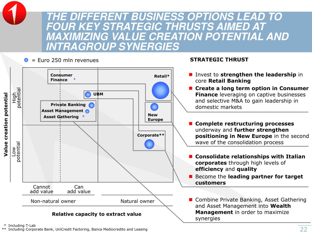 Consumer Finance Retail* UBM Private Banking Asset Management New Europe Asset Gathering Corporate** THE DIFFERENT BUSINESS OPTIONS LEAD TO FOUR KEY STRATEGIC THRUSTS AIMED AT MAXIMIZING VALUE CREATION POTENTIAL AND INTRAGROUP SYNERGIES STRATEGIC THRUST = Euro 250 mln revenues • Invest to strengthen the leadership in core Retail Banking • Create a long term option in Consumer Finance leveraging on captive businesses and selective M&A to gain leadership in domestic markets High potential • Complete restructuring processes underway and further strengthen positioning in New Europe in the second wave of the consolidation process Value creation potential Low potential • Consolidate relationships with Italian corporates through high levels of efficiency and quality • Become the leading partner for target customers Cannot add value Can add value • Combine Private Banking, Asset Gathering and Asset Management into Wealth Management in order to maximize synergies Non-natural owner Natural owner Relative capacity to extract value * Including T-Lab ** Including Corporate Bank, UniCredit Factoring, Banca Mediocredito and Leasing