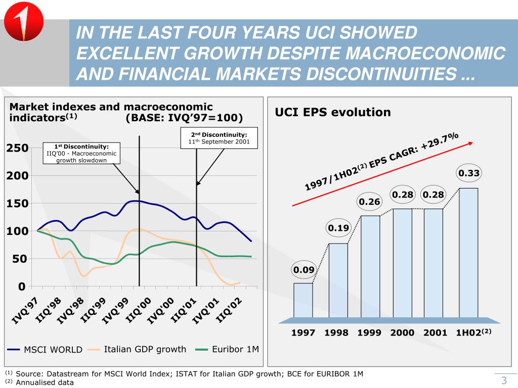 0.33 0.28 0.28 0.26 0.19 0.09 1997 1998 1999 2000 2001 1H02(2) IN THE LAST FOUR YEARS UCI SHOWED EXCELLENT GROWTH DESPITE MACROECONOMIC AND FINANCIAL MARKETS DISCONTINUITIES ... Market indexes and macroeconomic indicators(1) (BASE: IVQ’97=100) UCI EPS evolution 2nd Discontinuity: 11th September 2001 250 1st Discontinuity: IIQ’00 - Macroeconomic growth slowdown 1997/1H02(2) EPS CAGR: +29.7% 200 150 100 50 0 IIQ'98 IIQ'99 IIQ'00 IIQ'01 IIQ'02 IVQ'97 IVQ'98 IVQ'99 IVQ'00 IVQ'01 Italian GDP growth Euribor 1M MSCI WORLD (1) Source: Datastream for MSCI World Index; ISTAT for Italian GDP growth; BCE for EURIBOR 1M (2) Annualised data
