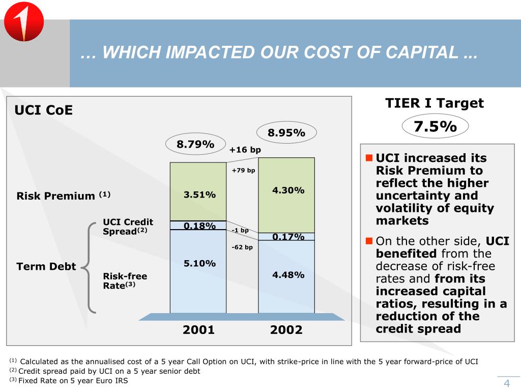 … WHICH IMPACTED OUR COST OF CAPITAL ... TIER I Target UCI CoE 7.5% 8.95% 8.79% +16 bp • UCI increased its Risk Premium to reflect the higher uncertainty and volatility of equity markets +79 bp 4.30% Risk Premium (1) 3.51% UCI Credit Spread(2) 0.18% -1 bp 0.17% • On the other side, UCI benefited from the decrease of risk-free rates and from its increased capital ratios, resulting in a reduction of the credit spread -62 bp Term Debt 5.10% Risk-free Rate(3) 4.48% 2001 2002 (1) Calculated as the annualised cost of a 5 year Call Option on UCI, with strike-price in line with the 5 year forward-price of UCI (2) Credit spread paid by UCI on a 5 year senior debt (3) Fixed Rate on5 year Euro IRS