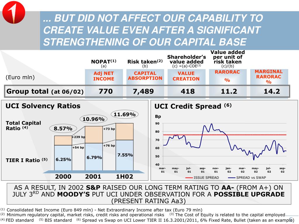UCI Credit Spread (6) Bp 90 80 70 60 50 40 mar- may- jul- sep- nov- jan- mar- may- jul- sep- 01 01 01 01 01 02 02 02 02 02 ISSUE SPREAD SPREAD vs SWAP ... BUT DID NOT AFFECT OUR CAPABILITY TO CREATE VALUE EVEN AFTER A SIGNIFICANT STRENGTHENING OF OUR CAPITAL BASE NOPAT(1) (a) Risk taken(2) (b) Shareholder’s value added (c) =(a)-COE(3) Value added per unit of risk taken (c)/(b) MARGINAL RARORAC% RARORAC % Adj NET INCOME VALUE CREATION CAPITAL ABSORPTION (Euro mln) Group total (at 06/02) 770 7,489 418 11.2 14.2 UCI Solvency Ratios 11.69% 10.96% Total Capital Ratio (4) 8.57% +73 bp +239 bp +76 bp +54 bp 7.55% 6.79% TIER I Ratio (5) 6.25% 2000 2001 1H02 AS A RESULT, IN 2002 S&P RAISED OUR LONG TERM RATING TO AA- (FROM A+) ON JULY 3RD AND MOODY’S PUT UCI UNDER OBSERVATION FOR A POSSIBLE UPGRADE (PRESENT RATING Aa3) (1) Consolidated Net Income (Euro 849 mln) - Net Extraordinary Income after tax (Euro 79 mln) (2) Minimum regulatory capital, market risks, credit risks and operational risks (3) The Cost of Equity is related to the capital employed (4) FED standard (5) BIS standard (6) Spread vs Swap on UCI Lower TIER II 16.3.2001/2011, 6% Fixed Rate, Bullet (taken as an example)