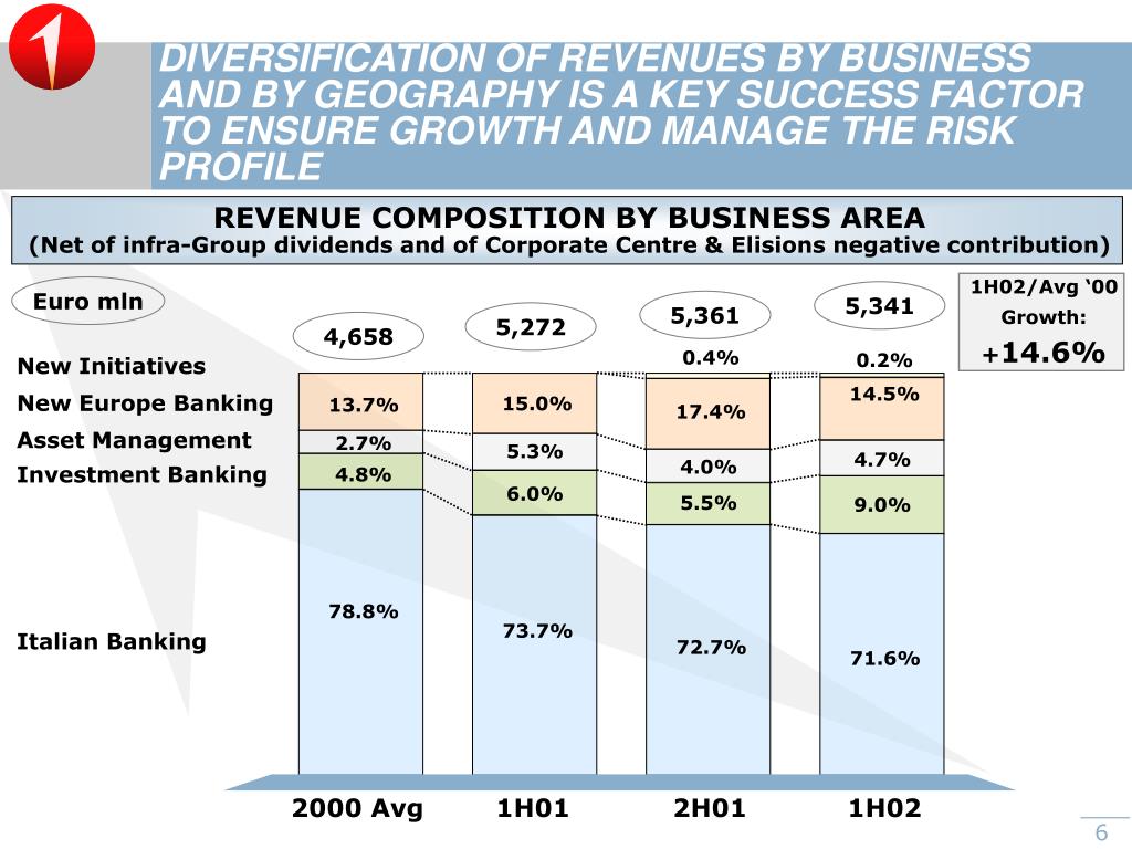 DIVERSIFICATION OF REVENUES BY BUSINESS AND BY GEOGRAPHY IS A KEY SUCCESS FACTOR TO ENSURE GROWTH AND MANAGE THE RISK PROFILE REVENUE COMPOSITION BY BUSINESS AREA (Net of infra-Group dividends and of Corporate Centre & Elisions negative contribution) 1H02/Avg ‘00 Growth: +14.6% Euro mln 5,341 5,361 5,272 4,658 New Initiatives 0.4% 0.2% New Europe Banking 14.5% 15.0% 13.7% 17.4% Asset Management 2.7% 5.3% 4.7% Investment Banking 4.0% 4.8% 6.0% 5.5% 9.0% 78.8% Italian Banking 73.7% 72.7% 71.6% 2000 Avg 1H01 2H01 1H02