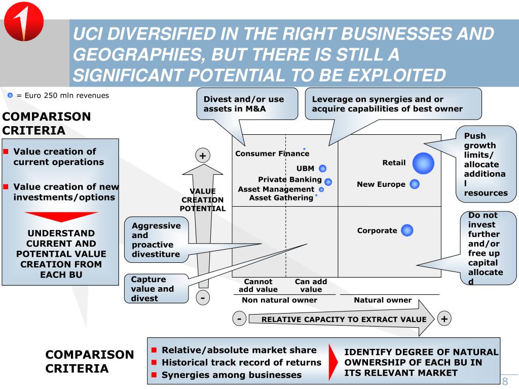 UCI DIVERSIFIED IN THE RIGHT BUSINESSES AND GEOGRAPHIES, BUT THERE IS STILL A SIGNIFICANT POTENTIAL TO BE EXPLOITED Divest and/or use assets in M&A Leverage on synergies and or acquire capabilities of best owner = Euro 250 mln revenues COMPARISON CRITERIA Push growth limits/ allocate additional resources • Value creation of current operations • Value creation of new investments/options + Consumer Finance Retail UBM Private Banking New Europe Asset Management VALUE CREATION POTENTIAL Asset Gathering Do not invest further and/or free up capital allocated Aggressive and proactive divestiture Corporate UNDERSTAND CURRENT AND POTENTIAL VALUE CREATION FROM EACH BU Capture value and divest Cannot add value Can add value - Non natural owner Natural owner + - RELATIVE CAPACITY TO EXTRACT VALUE • Relative/absolute market share • Historical track record of returns • Synergies among businesses IDENTIFY DEGREE OF NATURAL OWNERSHIP OF EACH BU IN ITS RELEVANT MARKET COMPARISON CRITERIA