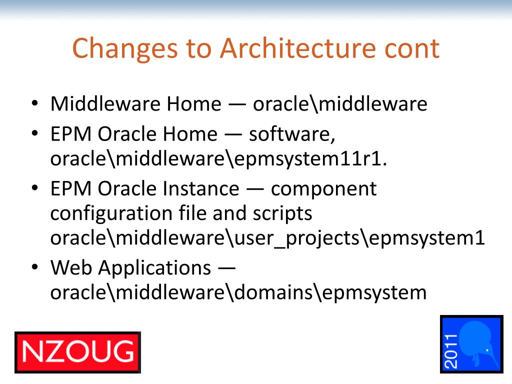 Changes to Architecture cont • Middleware Home — oracle\middleware • EPM Oracle Home — software, oracle\middleware\epmsystem11r1. • EPM Oracle Instance — component configuration file and scripts oracle\middleware\user_projects\epmsystem1 • Web Applications — oracle\middleware\domains\epmsystem