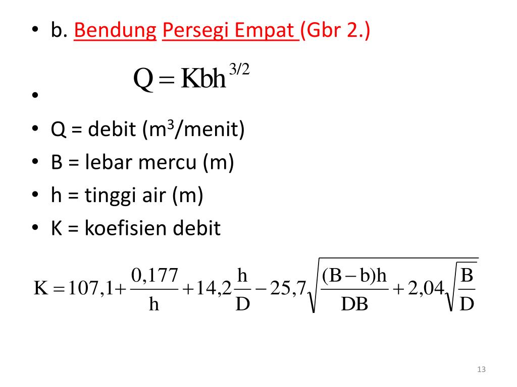 Q = debit (m3/menit) • B = lebarmercu (m) • h = tinggi air (m) • K = koefisien debit • D : tinggidaridasarsalurankemercubendung (m) • ϵ : sukupengkoreksi