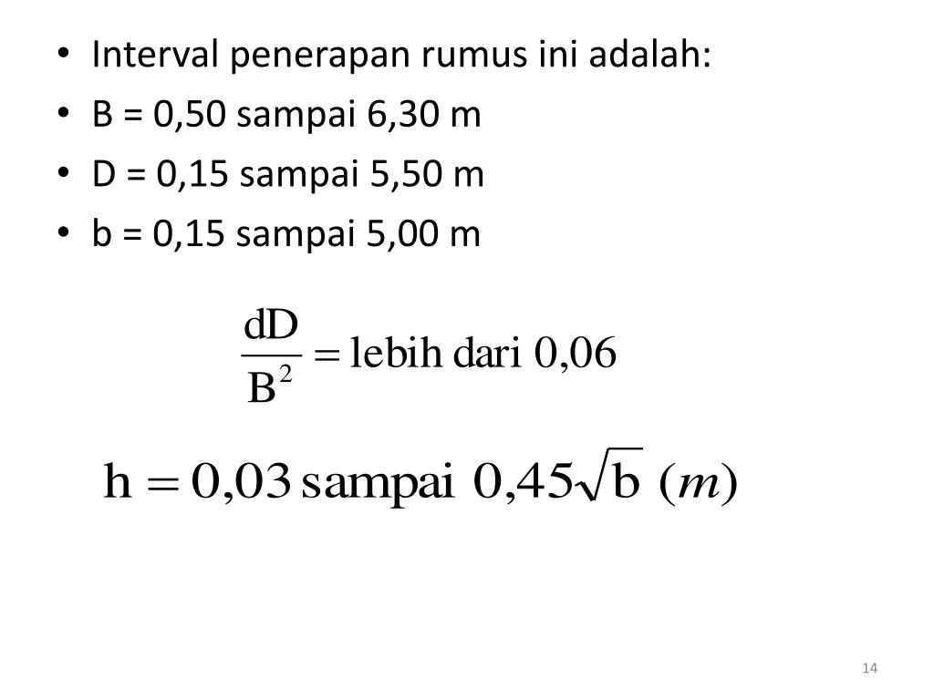 Interval penerapanrumusiniadalah: • B = 0,50 sampai 6,30 m • D = 0,15 sampai 5,50 m • b = 0,15 sampai 5,00 m