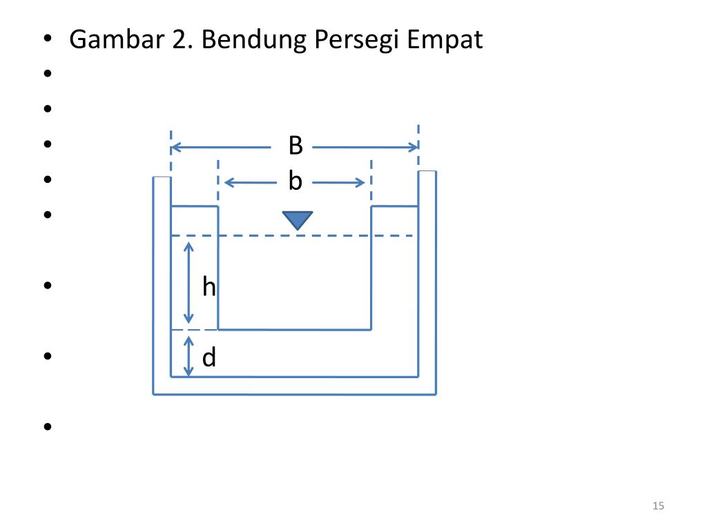 b. BendungPersegiEmpat(Gbr 2.) • Q = debit (m3/menit) • B = lebarmercu (m) • h = tinggi air (m) • K = koefisien debit