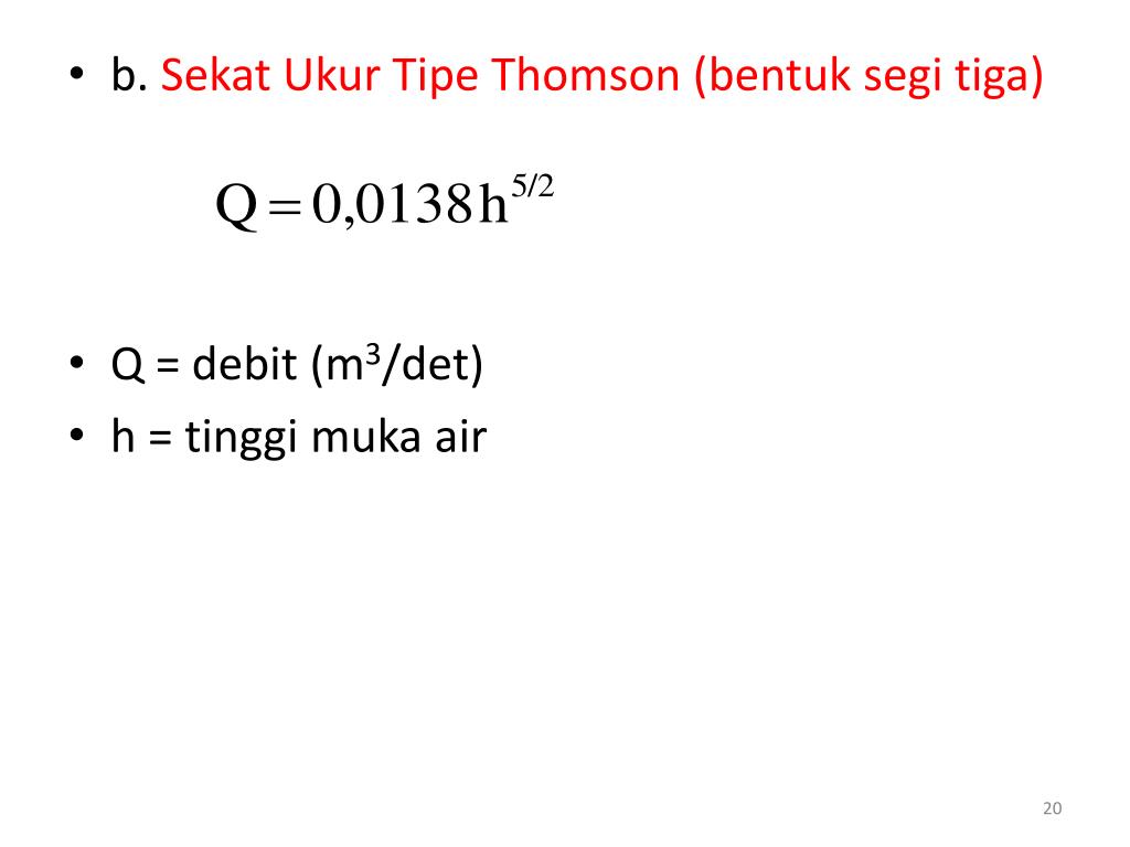 b.SekatUkurTipe Thomson (bentuksegitiga) • Q = debit (m3/det) • h = tinggimuka air