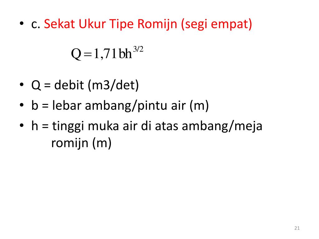 c. SekatUkurTipeRomijn (segiempat) • Q = debit (m3/det) • b = lebarambang/pintu air (m) • h = tinggimuka air diatasambang/mejaromijn (m)