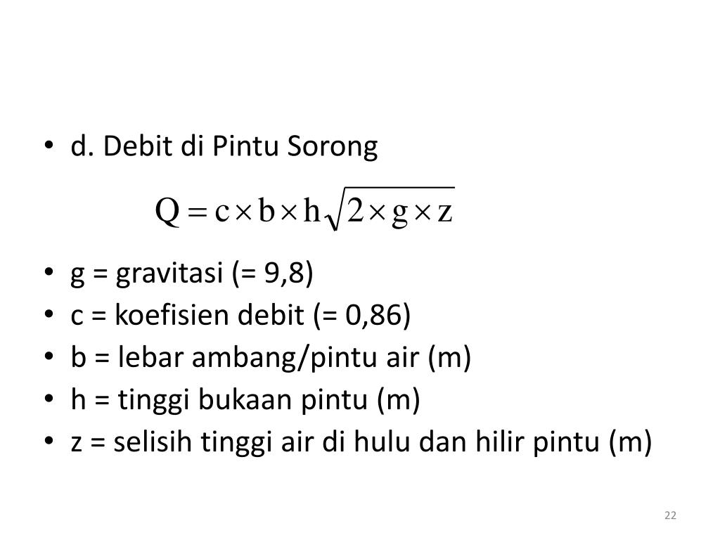 d. Debit diPintuSorong • g = gravitasi (= 9,8) • c = koefisien debit (= 0,86) • b = lebarambang/pintu air (m) • h = tinggibukaanpintu (m) • z = selisihtinggi air dihuludanhilirpintu (m)