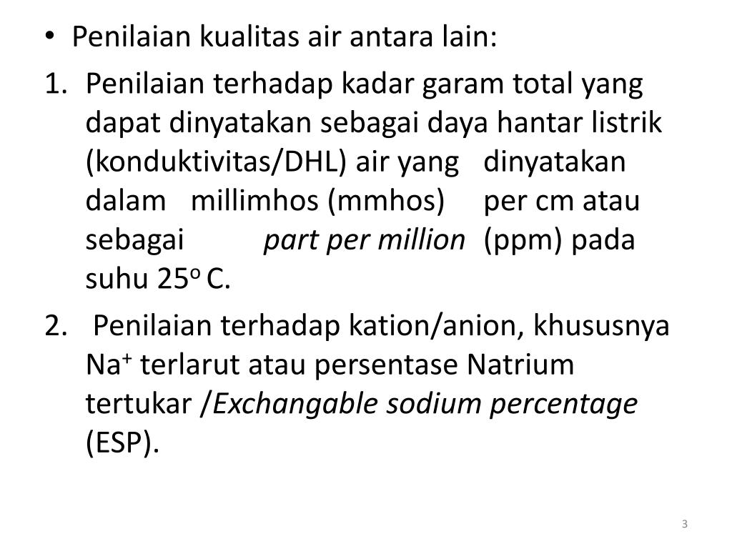 Penilaiankualitas air antara lain: • Penilaianterhadapkadargaram total yang dapatdinyatakansebagaidayahantarlistrik (konduktivitas/DHL) air yang dinyatakandalammillimhos (mmhos) per cm atausebagaipart per million (ppm) padasuhu 25o C. • Penilaianterhadapkation/anion, khususnya Na+terlarutataupersentaseNatriumtertukar /Exchangable sodium percentage (ESP).