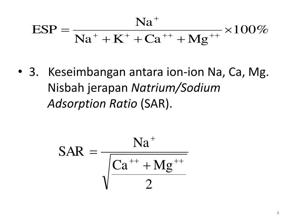 3. Keseimbanganantara ion-ion Na, Ca, Mg. NisbahjerapanNatrium/Sodium Adsorption Ratio (SAR).