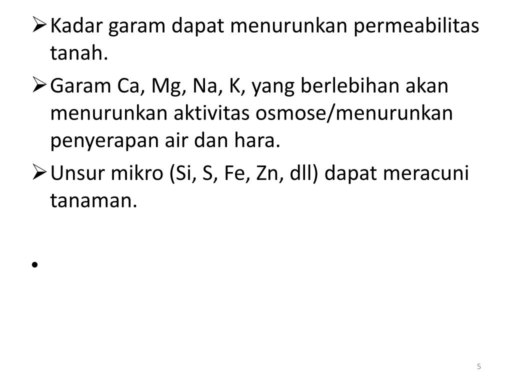Kadar garamdapatmenurunkanpermeabilitastanah. • Garam Ca, Mg, Na, K, yang berlebihanakanmenurunkanaktivitasosmose/menurunkanpenyerapan air danhara. • Unsurmikro (Si, S, Fe, Zn, dll) dapatmeracunitanaman.