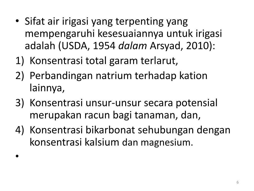 Sifat air irigasi yang terpenting yang mempengaruhikesesuaiannyauntukirigasiadalah (USDA, 1954 dalamArsyad, 2010): • Konsentrasi total garamterlarut, • Perbandingannatriumterhadapkationlainnya, • Konsentrasiunsur-unsursecarapotensialmerupakanracunbagitanaman, dan, • Konsentrasibikarbonatsehubungandengankonsentrasikalsiumdan magnesium.