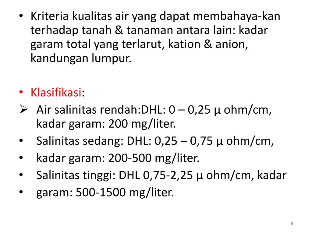 Kriteriakualitas air yang dapatmembahaya-kanterhadaptanah & tanamanantara lain: kadargaram total yang terlarut, kation & anion, kandunganlumpur. • Klasifikasi: • Air salinitasrendah:DHL: 0 – 0,25 µ ohm/cm, kadargaram: 200 mg/liter. • Salinitassedang: DHL: 0,25 – 0,75 µ ohm/cm, • kadargaram: 200-500 mg/liter. • Salinitastinggi: DHL 0,75-2,25 µ ohm/cm, kadar • garam: 500-1500 mg/liter.