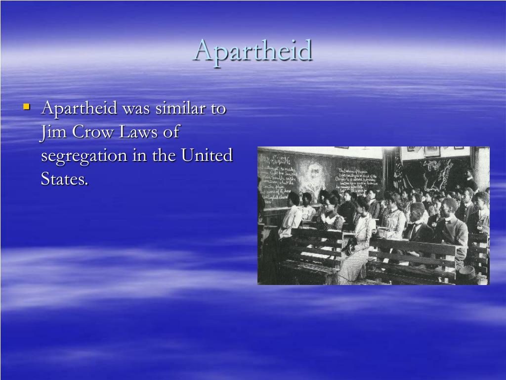 Apartheid • Apartheid was similar to Jim Crow Laws of segregation in the United States.
