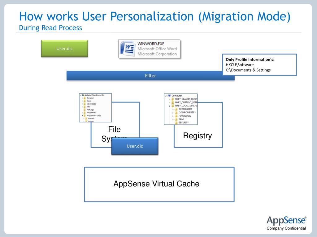 How works User Personalization (write) Sample.docx User.dic Reg value in HKCU\Software Only Profile Information’s: HKCU\Software C:\Documents & Settings Filter File System Registry AppSense Virtual Cache