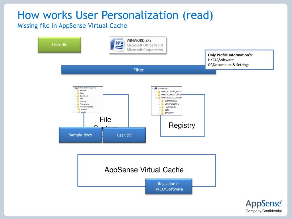 How works User Personalization (read)Missing file in AppSense Virtual Cache User.dic Only Profile Information’s: HKCU\Software C:\Documents & Settings Filter File System Registry Sample.docx User.dic AppSense Virtual Cache Reg value in HKCU\Software