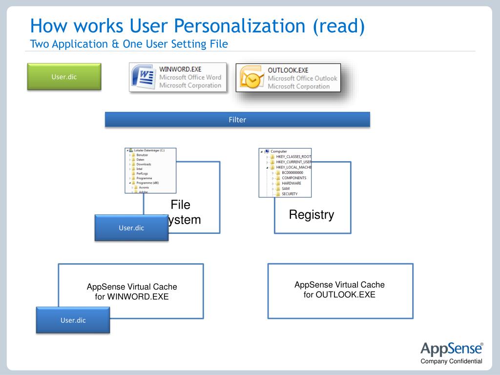 How works User Personalization (read)Two Application & One User Setting File User.dic Filter File System Registry User.dic AppSense Virtual Cache for OUTLOOK.EXE AppSense Virtual Cache for WINWORD.EXE User.dic