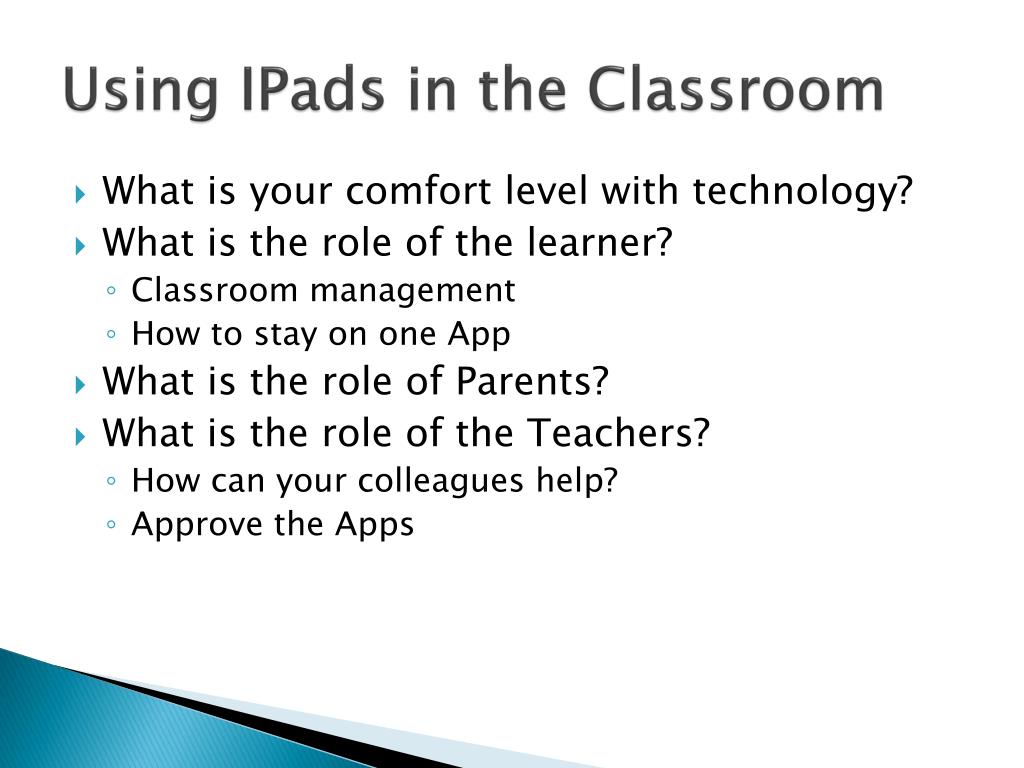 Using IPads in the Classroom • What is your comfort level with technology? • What is the role of the learner? • Classroom management • How to stay on one App • What is the role of Parents? • What is the role of the Teachers? • How can your colleagues help? • Approve the Apps
