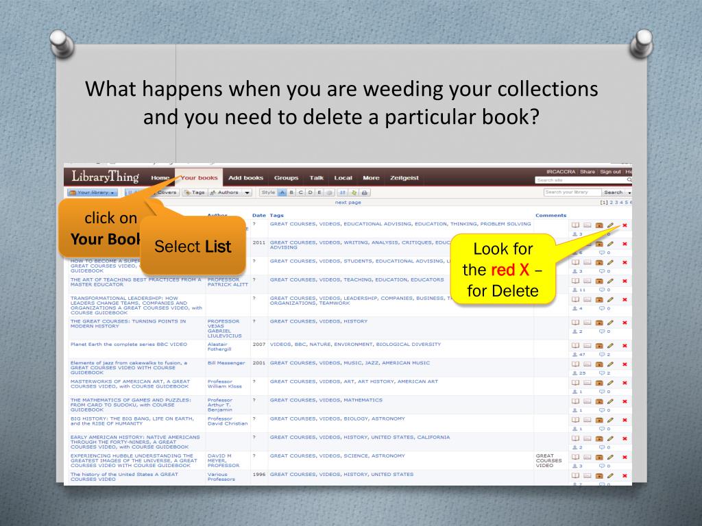 What happens when you are weeding your collections and you need to delete a particular book? click on Your Books Select List Look for the red X – for Delete