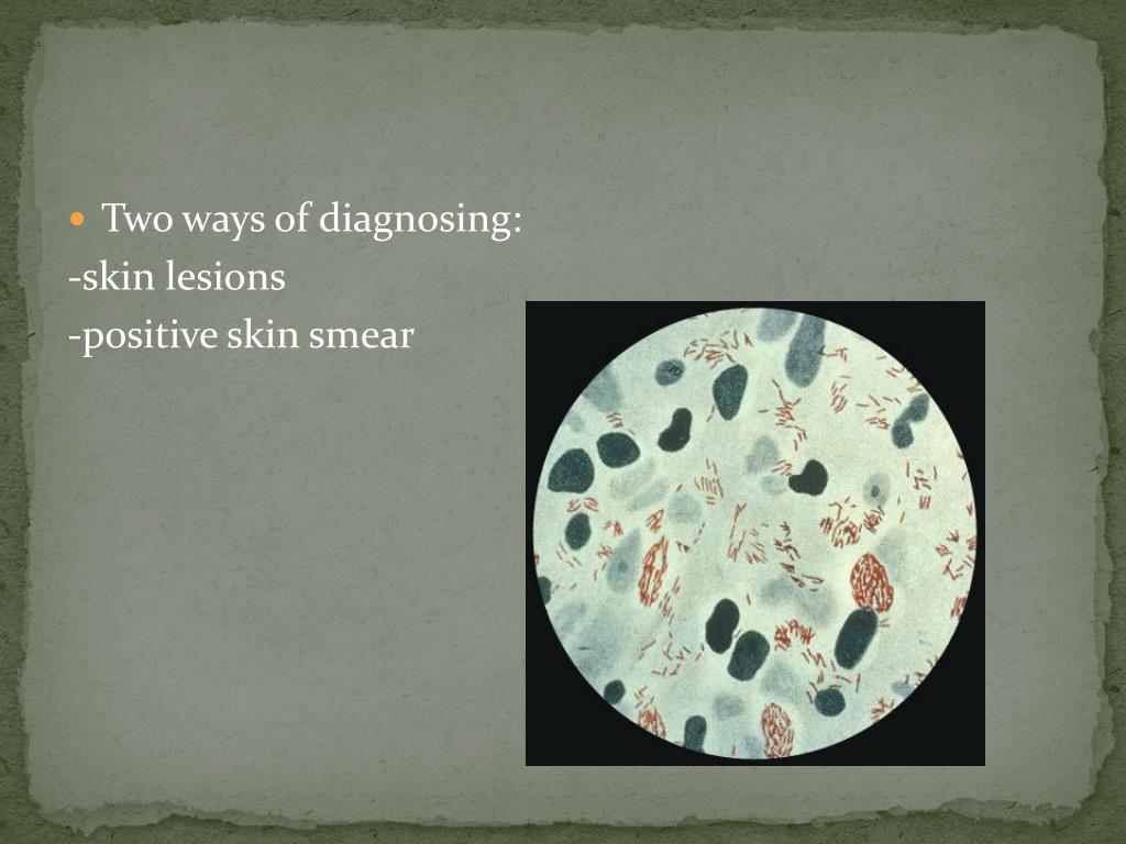 Two ways of diagnosing: -skin lesions -positive skin smear