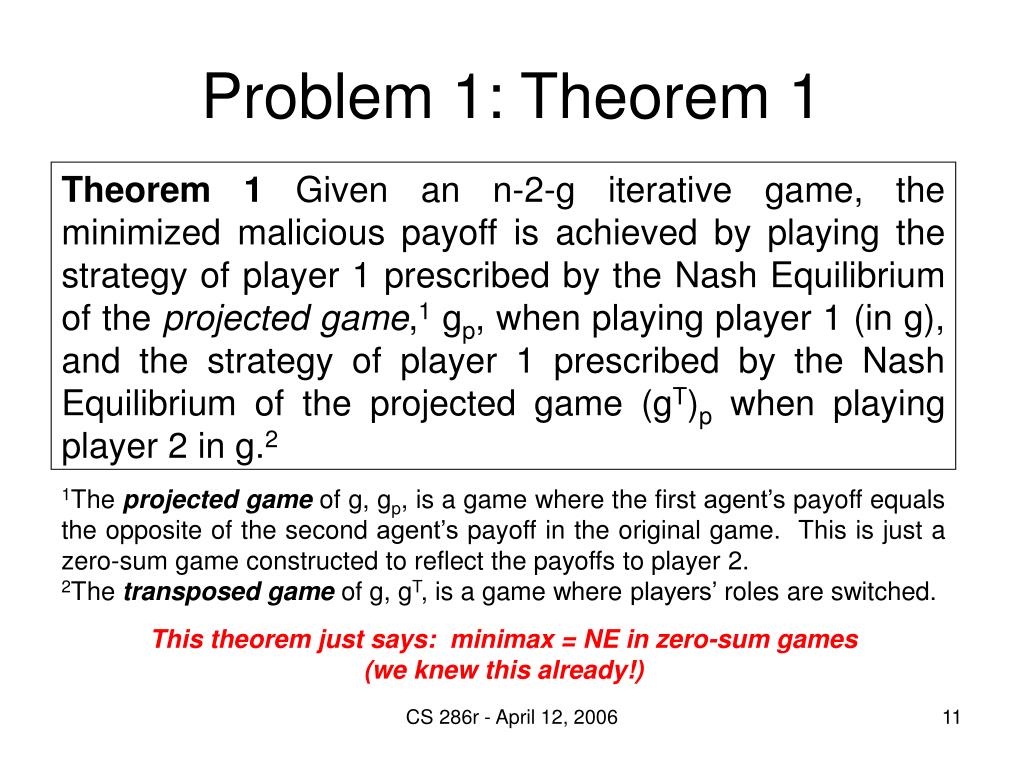 Problem 1: Theorem 1 Theorem 1 Given an n-2-g iterative game, the minimized malicious payoff is achieved by playing the strategy of player 1 prescribed by the Nash Equilibrium of the projected game,1 gp, when playing player 1 (in g), and the strategy of player 1 prescribed by the Nash Equilibrium of the projected game (gT)p when playing player 2 in g.2 1The projected game of g, gp, is a game where the first agent’s payoff equals the opposite of the second agent’s payoff in the original game. This is just a zero-sum game constructed to reflect the payoffs to player 2. 2The transposed game of g, gT, is a game where players’ roles are switched. This theorem just says: minimax = NE in zero-sum games (we knew this already!) CS 286r - April 12, 2006