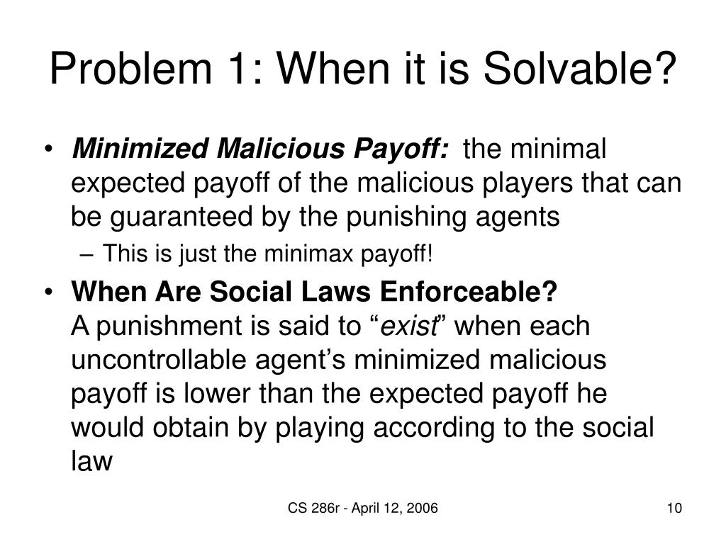 Problem 1: When it is Solvable? • Minimized Malicious Payoff: the minimal expected payoff of the malicious players that can be guaranteed by the punishing agents • This is just the minimax payoff! • When Are Social Laws Enforceable? A punishment is said to “exist” when each uncontrollable agent’s minimized malicious payoff is lower than the expected payoff he would obtain by playing according to the social law CS 286r - April 12, 2006