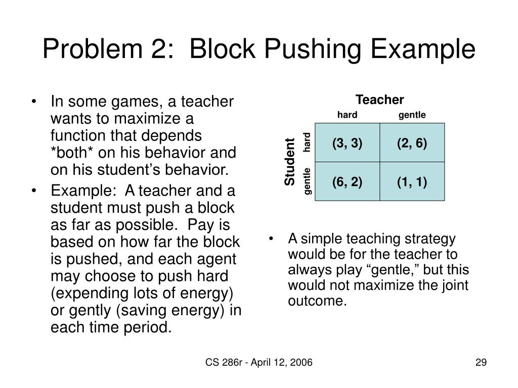 In some games, a teacher wants to maximize a function that depends *both* on his behavior and on his student’s behavior. Example: A teacher and a student must push a block as far as possible. Pay is based on how far the block is pushed, and each agent may choose to push hard (expending lots of energy) or gently (saving energy) in each time period. A simple teaching strategy would be for the teacher to always play “gentle,” but this would not maximize the joint outcome. Teacher hard gentle (3, 3) (2, 6) hard Student (6, 2) (1, 1) gentle Problem 2: Block Pushing Example CS 286r - April 12, 2006