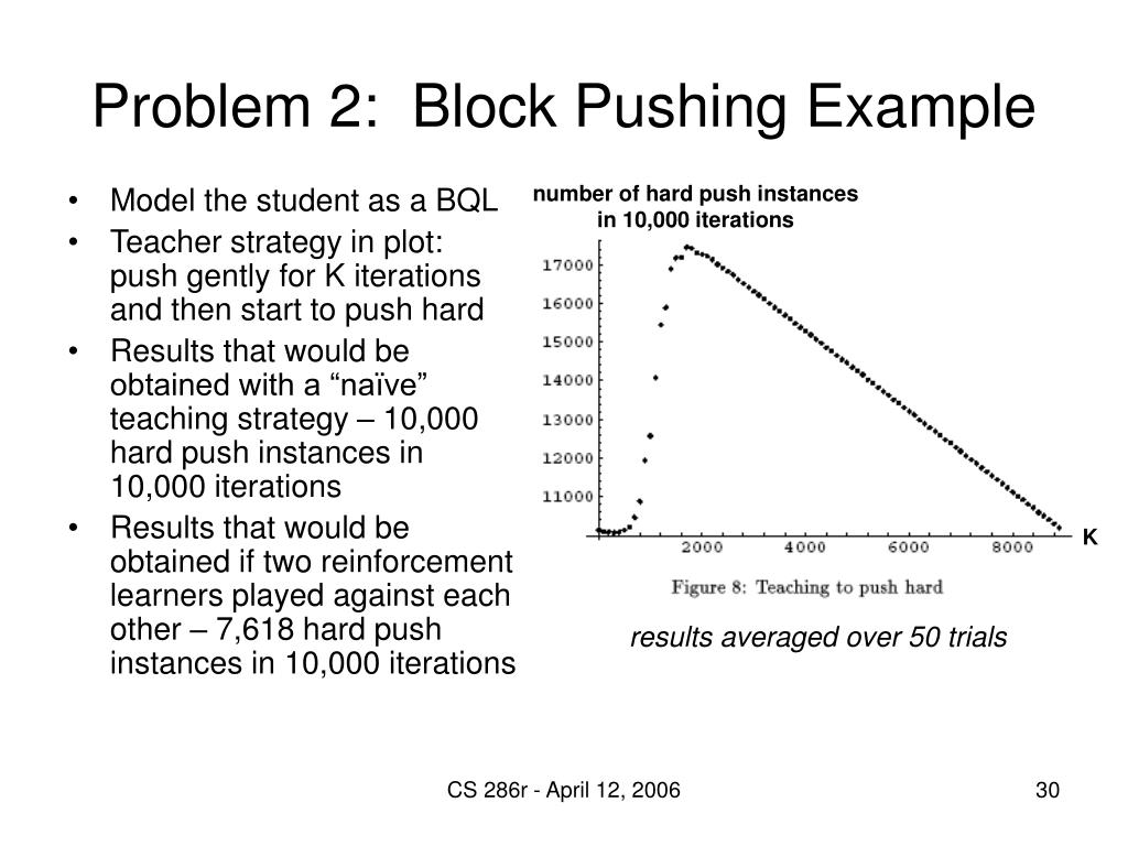 results averaged over 50 trials Model the student as a BQL Teacher strategy in plot: push gently for K iterations and then start to push hard Results that would be obtained with a “naïve” teaching strategy – 10,000 hard push instances in 10,000 iterations Results that would be obtained if two reinforcement learners played against each other – 7,618 hard push instances in 10,000 iterations number of hard push instances in 10,000 iterations K Problem 2: Block Pushing Example CS 286r - April 12, 2006