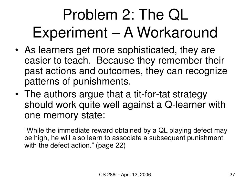 Problem 2: The QL Experiment – A Workaround • As learners get more sophisticated, they are easier to teach. Because they remember their past actions and outcomes, they can recognize patterns of punishments. • The authors argue that a tit-for-tat strategy should work quite well against a Q-learner with one memory state: “While the immediate reward obtained by a QL playing defect may be high, he will also learn to associate a subsequent punishment with the defect action.” (page 22) CS 286r - April 12, 2006