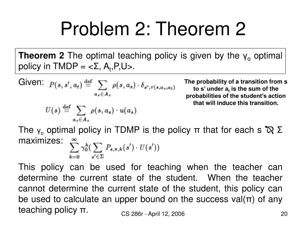 Problem 2: Theorem 2 Theorem 2 The optimal teaching policy is given by the γo optimal policy in TMDP = <Σ, At,P,U>. Given: The γo optimal policy in TDMP is the policy π that for each s  Σ maximizes: This policy can be used for teaching when the teacher can determine the current state of the student. When the teacher cannot determine the current state of the student, this policy can be used to calculate an upper bound on the success val(π) of any teaching policy π. The probability of a transition from s to s’ under at is the sum of the probabilities of the student’s action that will induce this transition. CS 286r - April 12, 2006