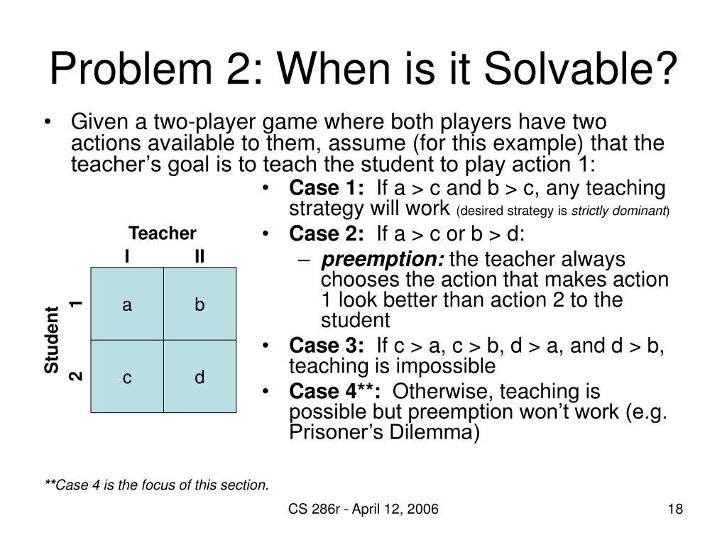 Given a two-player game where both players have two actions available to them, assume (for this example) that the teacher’s goal is to teach the student to play action 1: Case 1: If a > c and b > c, any teaching strategy will work (desired strategy is strictly dominant) Case 2: If a > c or b > d: preemption: the teacher always chooses the action that makes action 1 look better than action 2 to the student Case 3: If c > a, c > b, d > a, and d > b, teaching is impossible Case 4**: Otherwise, teaching is possible but preemption won’t work (e.g. Prisoner’s Dilemma) Teacher I II a b 1 c d Student 2 Problem 2: When is it Solvable? **Case 4 is the focus of this section. CS 286r - April 12, 2006