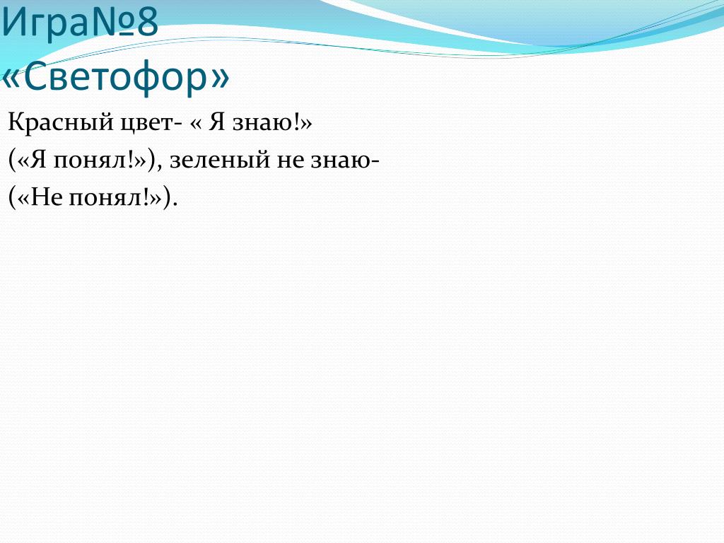 Игра№8«Светофор» Красный цвет- « Я знаю!» («Я понял!»), зеленый не знаю- («Не понял!»).