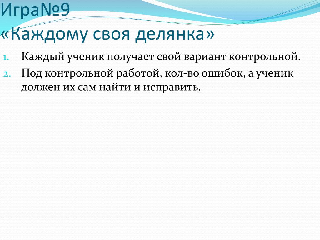 Игра№9«Каждому своя делянка» • Каждый ученик получает свой вариант контрольной. • Под контрольной работой, кол-во ошибок, а ученик должен их сам найти и исправить.
