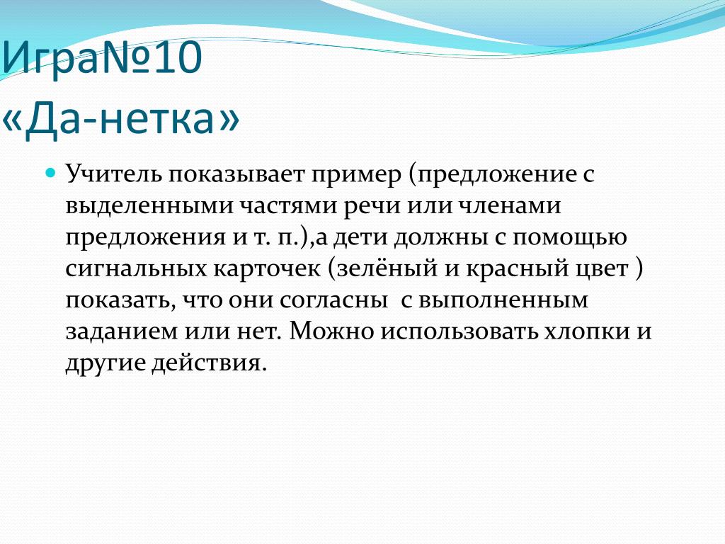Игра№10«Да-нетка» • Учитель показывает пример (предложение с выделенными частями речи или членами предложения и т. п.),а дети должны с помощью сигнальных карточек (зелёный и красный цвет ) показать, что они согласны с выполненным заданием или нет. Можно использовать хлопки и другие действия.
