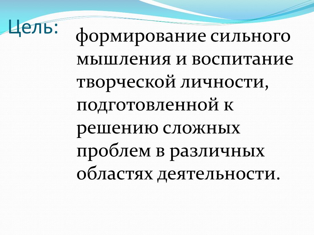 Цель: формирование сильного мышления и воспитание творческой личности, подготовленной к решению сложных проблем в различных областях деятельности.