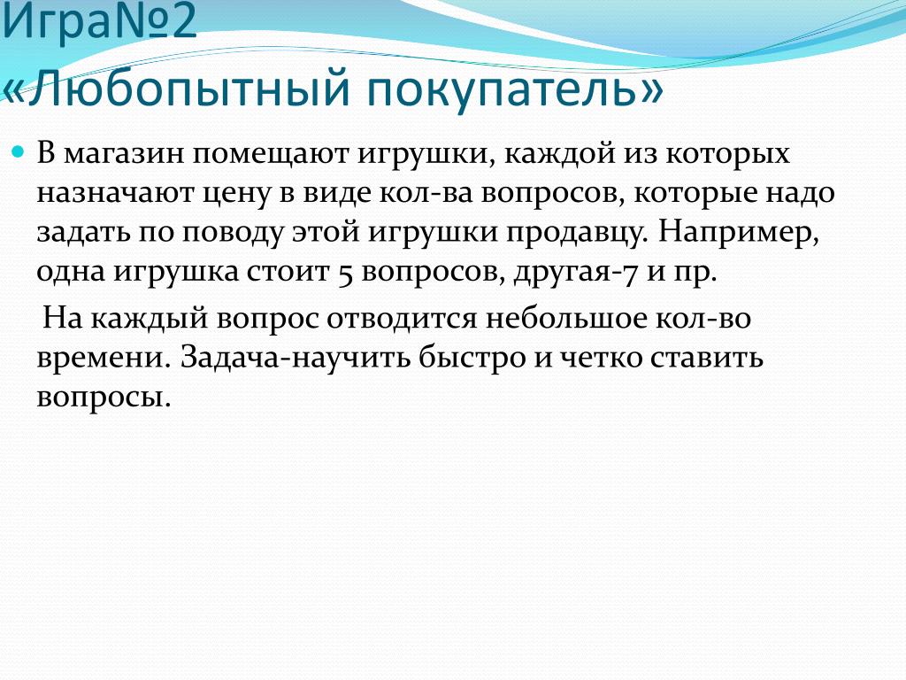 Игра№2 «Любопытный покупатель» • В магазин помещают игрушки, каждой из которых назначают цену в виде кол-ва вопросов, которые надо задать по поводу этой игрушки продавцу. Например, одна игрушка стоит 5 вопросов, другая-7 и пр. На каждый вопрос отводится небольшое кол-во времени. Задача-научить быстро и четко ставить вопросы.