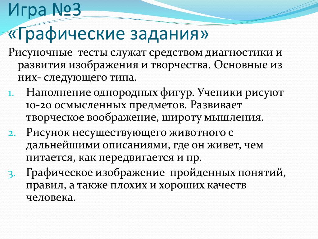 Игра №3«Графические задания» Рисуночные тесты служат средством диагностики и развития изображения и творчества. Основные из них- следующего типа. • Наполнение однородных фигур. Ученики рисуют 10-20 осмысленных предметов. Развивает творческое воображение, широту мышления. • Рисунок несуществующего животного с дальнейшими описаниями, где он живет, чем питается, как передвигается и пр. • Графическое изображение пройденных понятий, правил, а также плохих и хороших качеств человека.
