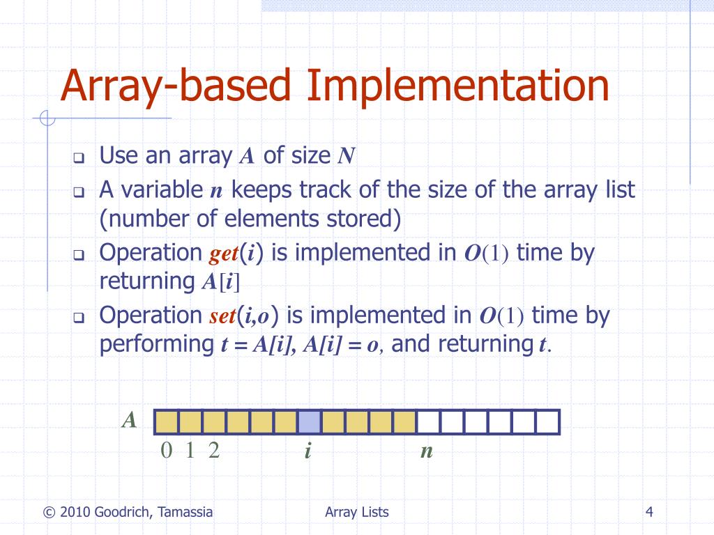 Use an array A of size N A variable n keeps track of the size of the array list (number of elements stored) Operation get(i) is implemented in O(1) time by returning A[i] Operation set(i,o) is implemented in O(1) time by performing t = A[i], A[i] = o, and returningt. Array-based Implementation A 0 1 2 n i Array Lists