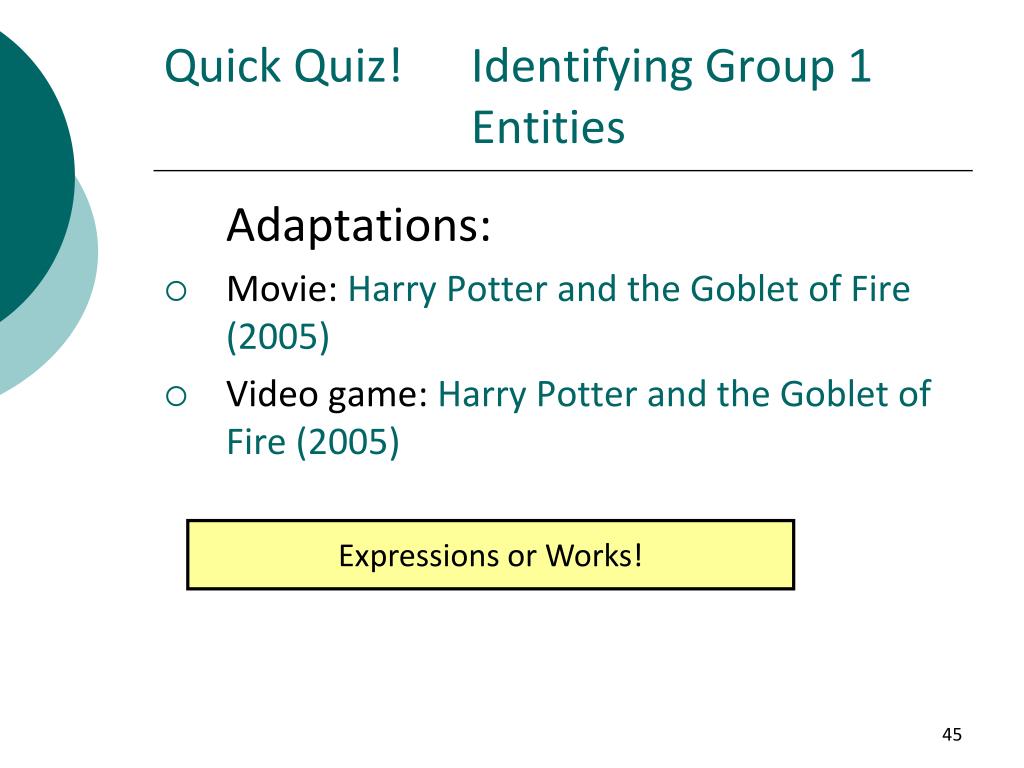 Quick Quiz! Identifying Group 1 Entities Adaptations: • Movie: Harry Potter and the Goblet of Fire (2005) • Video game: Harry Potter and the Goblet of Fire (2005) Expressions or Works!