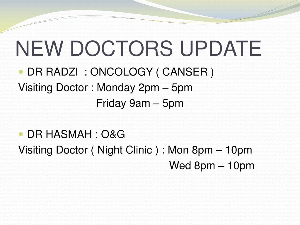 NEW DOCTORS UPDATE • DR RADZI : ONCOLOGY ( CANSER ) Visiting Doctor : Monday 2pm – 5pm Friday 9am – 5pm • DR HASMAH : O&G Visiting Doctor ( Night Clinic ) : Mon 8pm – 10pm Wed 8pm – 10pm