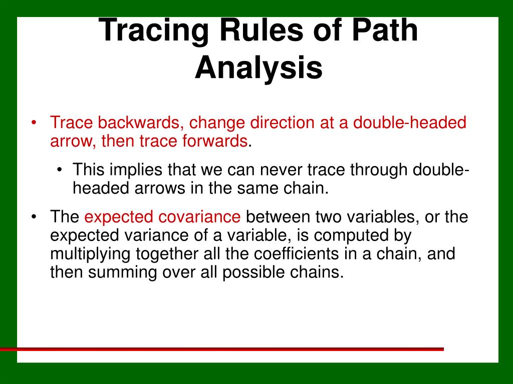 Tracing Rules of Path Analysis • Trace backwards, change direction at a double-headed arrow, then trace forwards. • This implies that we can never trace through double-headed arrows in the same chain. • The expected covariance between two variables, or the expected variance of a variable, is computed by multiplying together all the coefficients in a chain, and then summing over all possible chains.