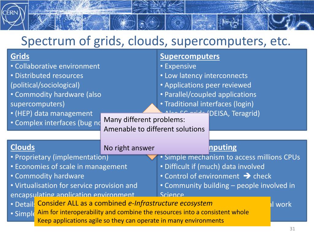 Spectrum of grids, clouds, supercomputers, etc. • Grids • Collaborative environment • Distributed resources (political/sociological) • Commodity hardware (also supercomputers) • (HEP) data management • Complex interfaces (bug not feature) • Supercomputers • Expensive • Low latency interconnects • Applications peer reviewed • Parallel/coupled applications • Traditional interfaces (login) • Also SC grids (DEISA, Teragrid) Many different problems: Amenable to different solutions No right answer • Clouds • Proprietary (implementation) • Economies of scale in management • Commodity hardware • Virtualisation for service provision and encapsulating application environment • Details of physical resources hidden • Simple interfaces (too simple?) • Volunteer computing • Simple mechanism to access millions CPUs • Difficult if (much) data involved • Control of environment check • Community building – people involved in Science • Potential for huge amounts of real work • Consider ALL as a combined e-Infrastructure ecosystem • Aim for interoperability and combine the resources into a consistent whole • Keep applications agile so they can operate in many environments
