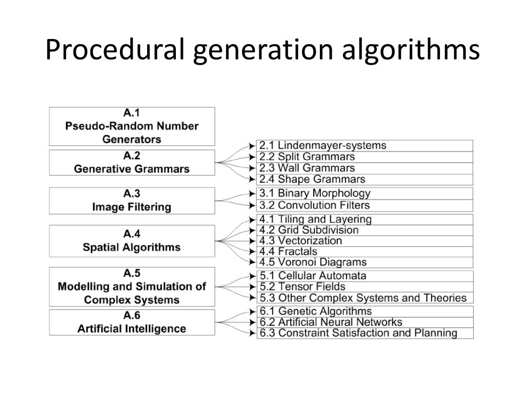 Survey of Procedural Content. Procedural Content Generation. Procedural generation refers to content generated algorithmically rather than manually . numbers, strings, movies , games, pictures, simulation, programs, natural language, etc. Why have procedural content? Replayability