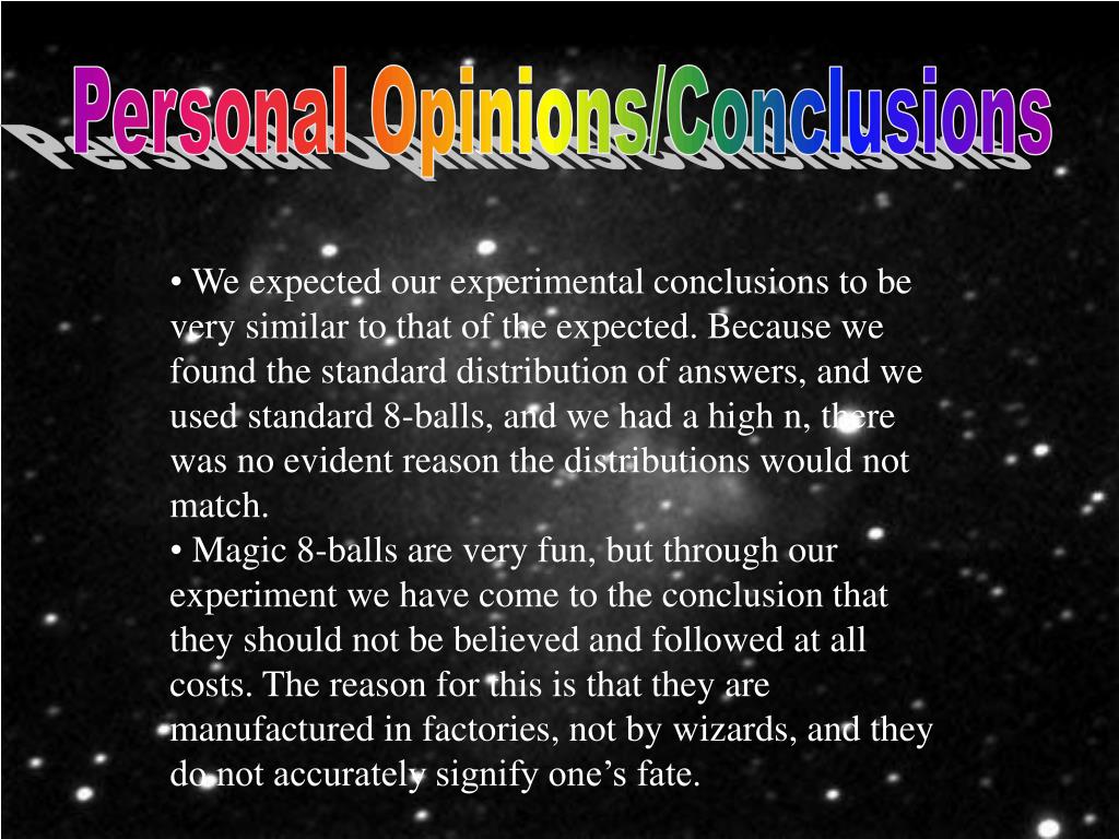 Personal Opinions/Conclusions • We expected our experimental conclusions to be very similar to that of the expected. Because we found the standard distribution of answers, and we used standard 8-balls, and we had a high n, there was no evident reason the distributions would not match. • Magic 8-balls are very fun, but through our experiment we have come to the conclusion that they should not be believed and followed at all costs. The reason for this is that they are manufactured in factories, not by wizards, and they do not accurately signify one’s fate.