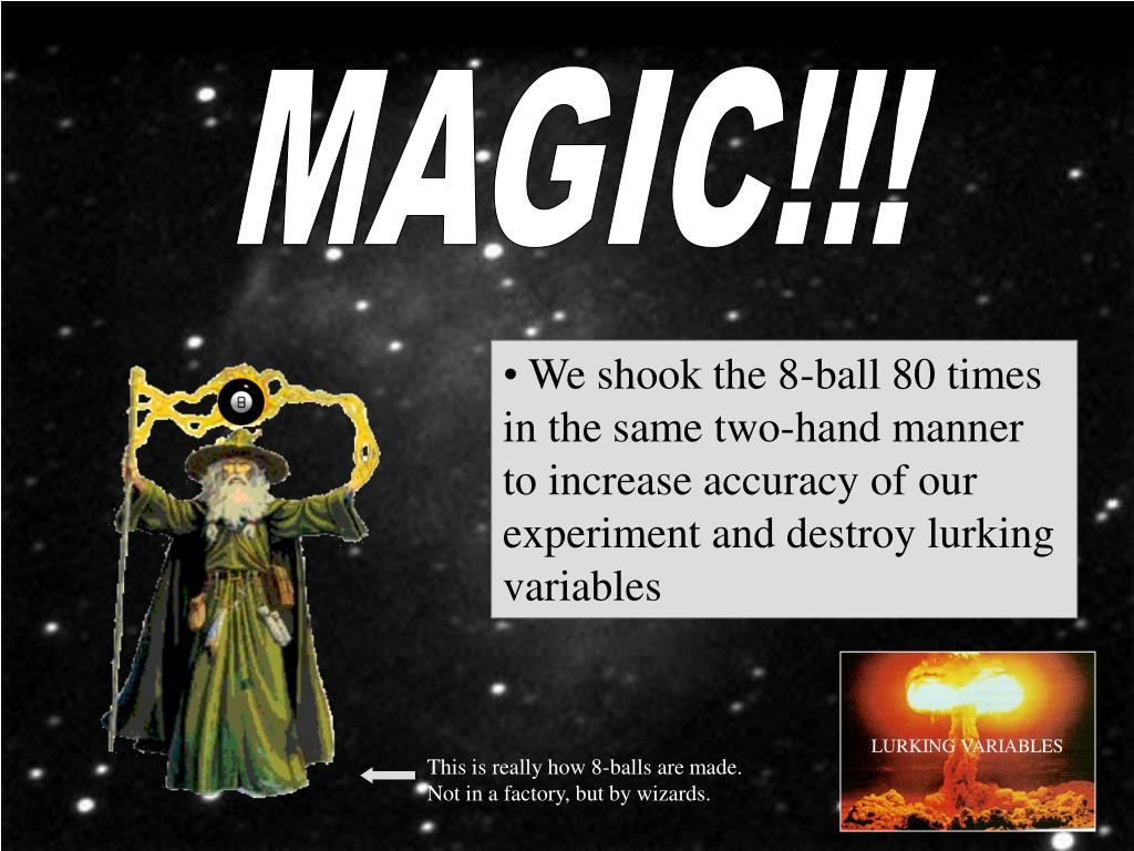 MAGIC!!! • We shook the 8-ball 80 times in the same two-hand manner to increase accuracy of our experiment and destroy lurking variables LURKING VARIABLES This is really how 8-balls are made. Not in a factory, but by wizards.